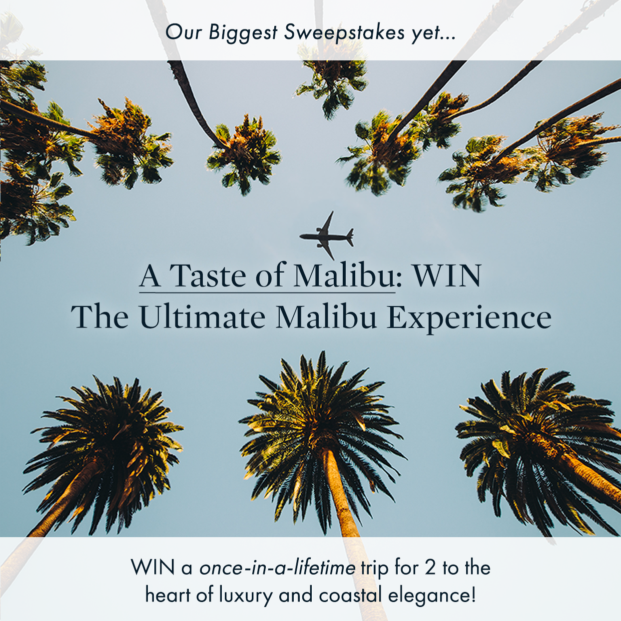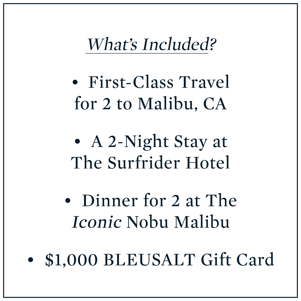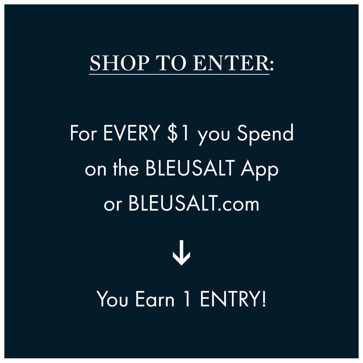 Win The Ultimate Malibu Experience! For every $1 spent on our app or site, you’ll get 1x entries for our sweepstakes*. Earn 3x entries 12/24/24 - 12/31/24. Shop Now *NO PURCHASE NECESSARY. Ends 12/31/24. Official Rules available at bleusalt.com/rules. Open to legal residents of the 50 US and DC at least 18+ or age of majority, whichever is greater. Void where prohibited. Names, logos, and/or materials associated with prize descriptions are used for purposes of promotion and/or prize descriptions only and such use is not intended to suggest or imply sponsorship or endorsement of this Sweepstakes.