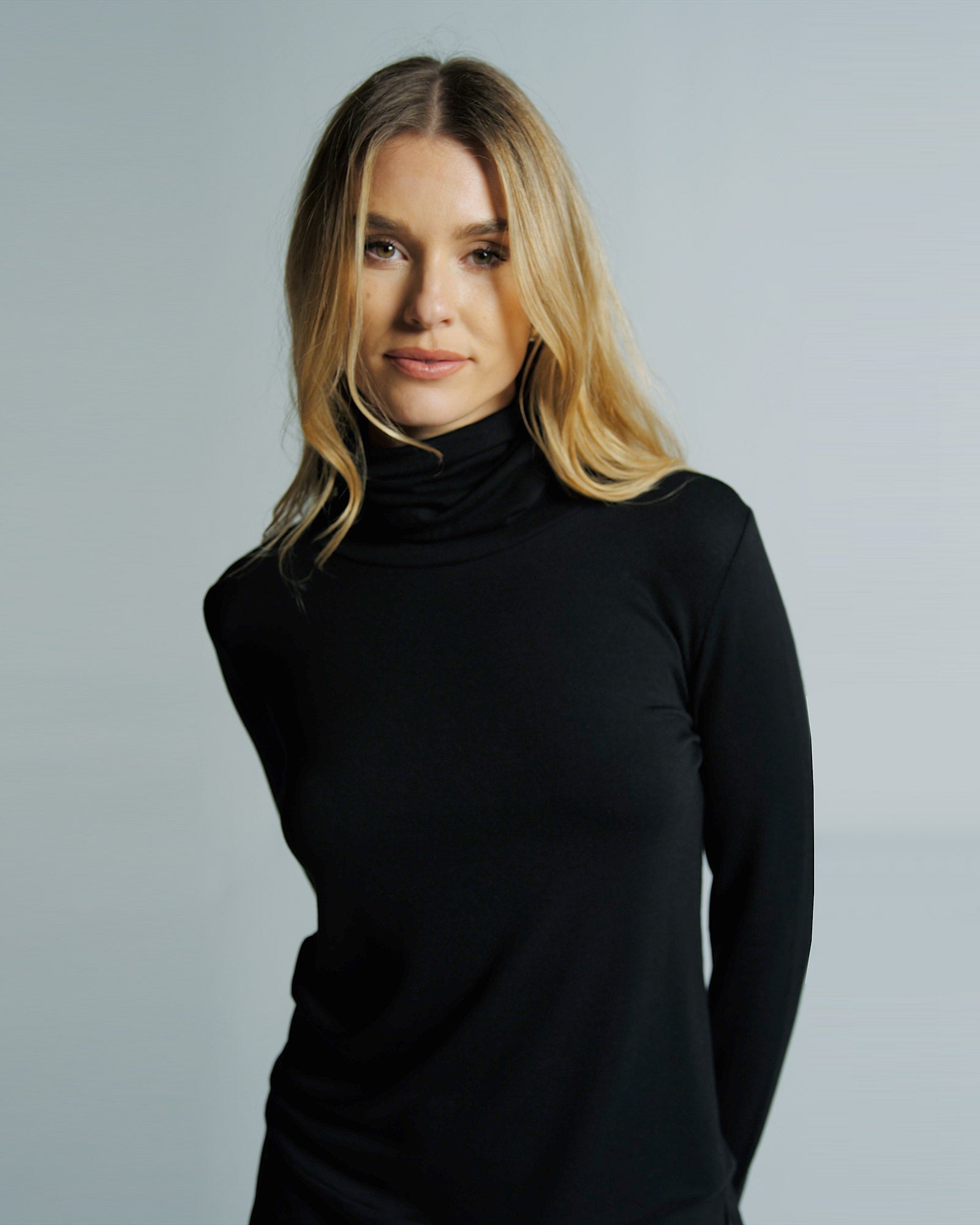 The Turtleneck features a full-length hem with a subtle waistband, slim-fit sleeves, and a soft, fold-over neckline—offering a clean silhouette with an easy, relaxed feel.